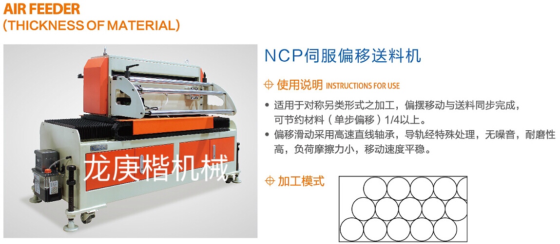 龍庚楷偏擺NC送料機工作原理如下:將由材料架開卷、整平整平后的材料料頭,穿過送料機托料架、送料滾筒、出料板后進入沖床模具內(nèi),在偏擺NC送料機7寸觸摸屏上設(shè)定高送料長度、送料寬度、圓片直徑、偏擺次數(shù)后,讓偏擺NC送料機自動運行,NC送料機伺服馬達一邊通過升降控制裝置控制沖壓連續(xù)模的沖壓動作,一邊通過物料前進輸送裝置控制物料前進的距離和速度,并通過橫向平移驅(qū)動裝置控制物料橫向平移的距離。這樣,當在板材上完成第一次沖壓時,NC送料機伺服馬達可通過橫向平移驅(qū)動裝置帶動活動機架橫向平移,進而帶動板材橫向平移適當?shù)木嚯x,使沖壓連續(xù)模先沿橫向排布方向?qū)Π宀倪M行逐個沖壓。當?shù)谝慌艣_壓完成后,使橫向平移驅(qū)動裝置帶動活動機架及物料橫向平移適當距離,物料前進輸送裝置帶動物料前進適當距離后,沖壓連續(xù)模接著進行第二排的沖壓工作。根據(jù)沖壓孔徑的大小和板材的寬度,通過精確計算每次橫向平移的距離和/或前進的距離,可使在板材上形成的各個沖壓孔之間的間隙最小,最大化的提高了材料的利用率。